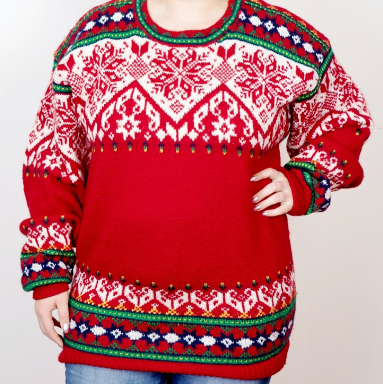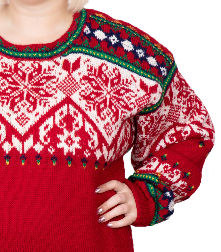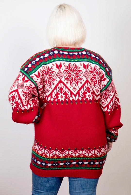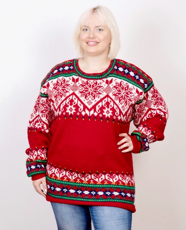 Erkpunasest paksemat sorti lambavillasest lõngast rahvusliku mustrikirjaga 60-ndate aastate suusakampsuni stiilis käsitsi kootud soe kampsun. Kampsuni esiosa ja seljatagune on ühesugused.