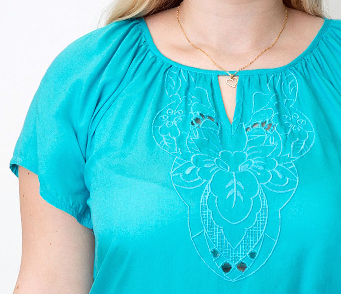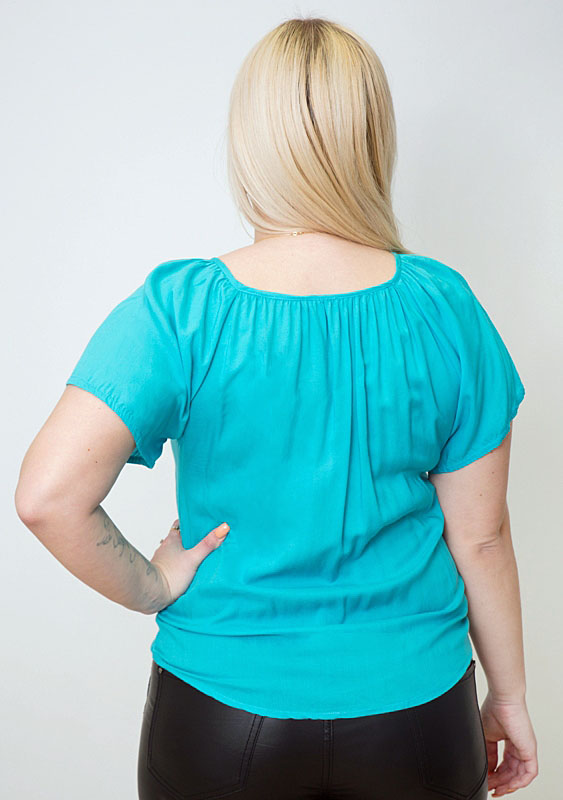 Erksast türkiisivärvi puuvilla ja viskoosisegu õhukesest kangast raglaanlõikeline topp rišeljöötikandis kaunistusega.