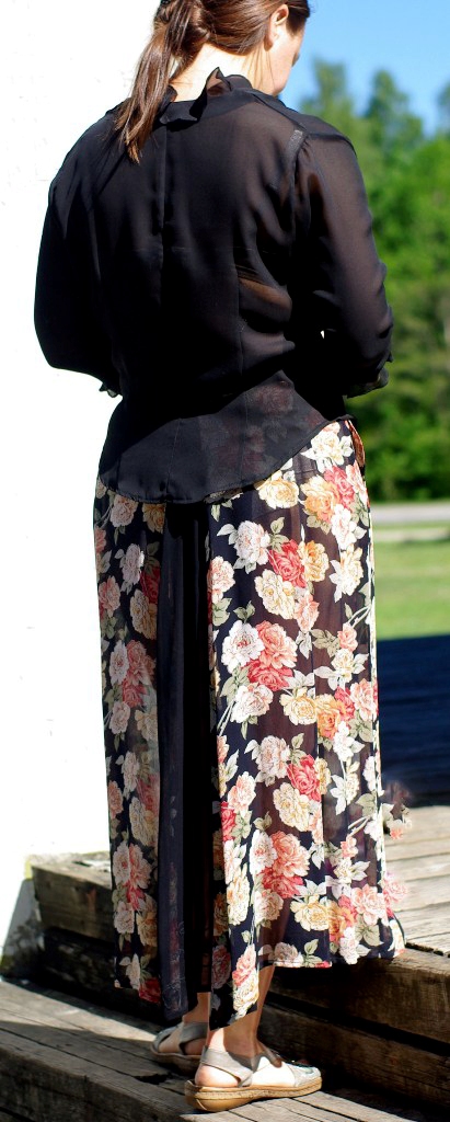 Õhulisest viskooskangast roosimustriline komplekt seelikust, vestist ja ühevärvilisest pluusist suurusele 40-42.