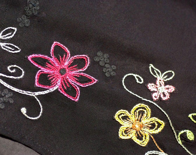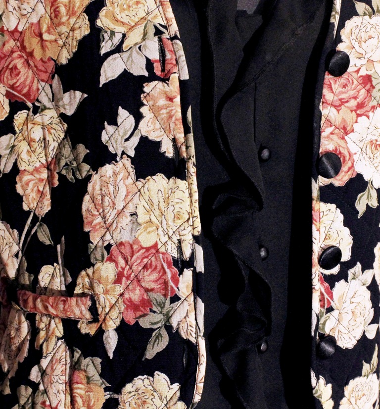 Pluusil kolmveerandvarrukad pikkusega 49 cm (mõõdetuna õlaõmblusest), otstes roosikirjust kangast atlaspaelaga ääristatud mansetid ja atlaspaelaga kaetud nööbiga. Manseti ümbermõõt 30 cm. Pluusi kaeluses, kinniseliistul ja varrukaotstes väikesed volangid. Pluus on eest nööbitav. Selja pikkus kaelusest 56 cm, külje pikkus varrukaaugust 27 cm. Pluus on eest ja tagant pikem, külgedelt kaarjalt lühem.