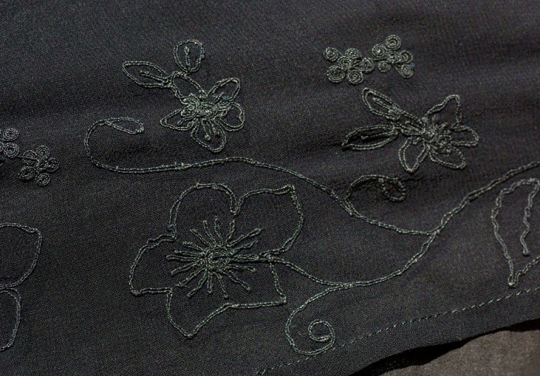 Seeliku külgedel on sisseõmmeldud taskud, ees ja taga mustast õhukesest kangast siilud, mille alumises osas tikand. Eesosas värviline tikand, tagaosa vahetükil sama mustriga tikand musta lõngaga. Seelikul atlaspaelast mitteveniv värvel, küljel tõmblukk. Seeliku pikkus on 92 cm, värvli laius 88 cm.