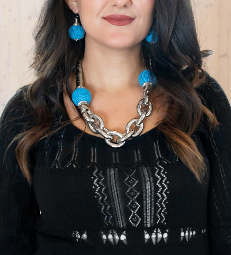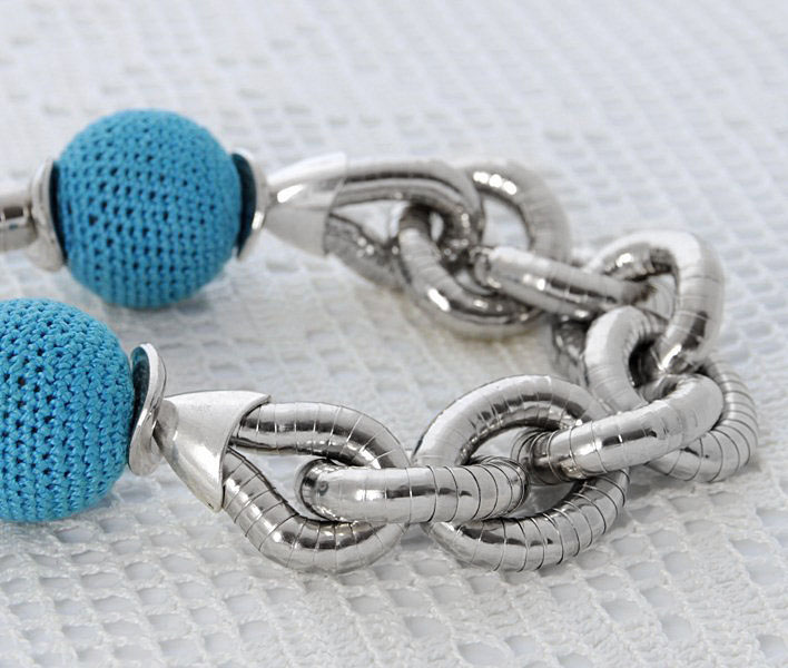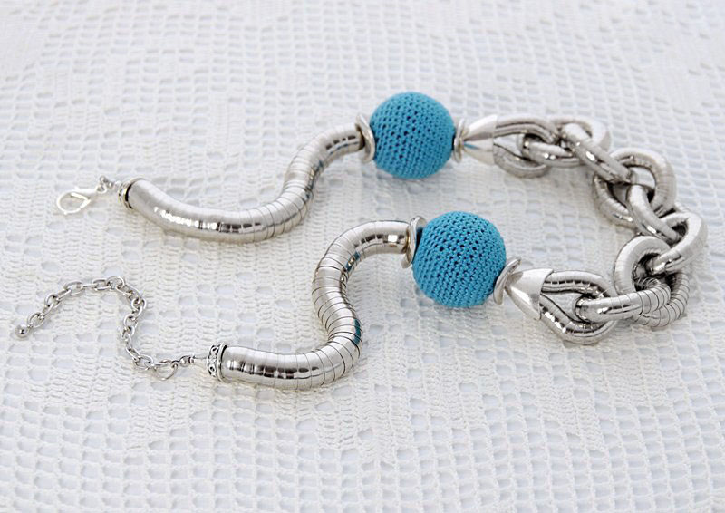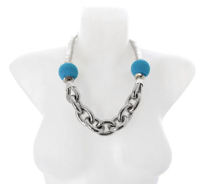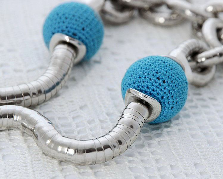 Kaelakee suured “lülid” koosnevad efektsetest rõngastest, mis koosnevad elastikkummile kinnitatud metallkapslitest. Heegeldatud helmeste sees on vahtplastist ümmargused detailid, mistõttu helmed on ka väga kerged.