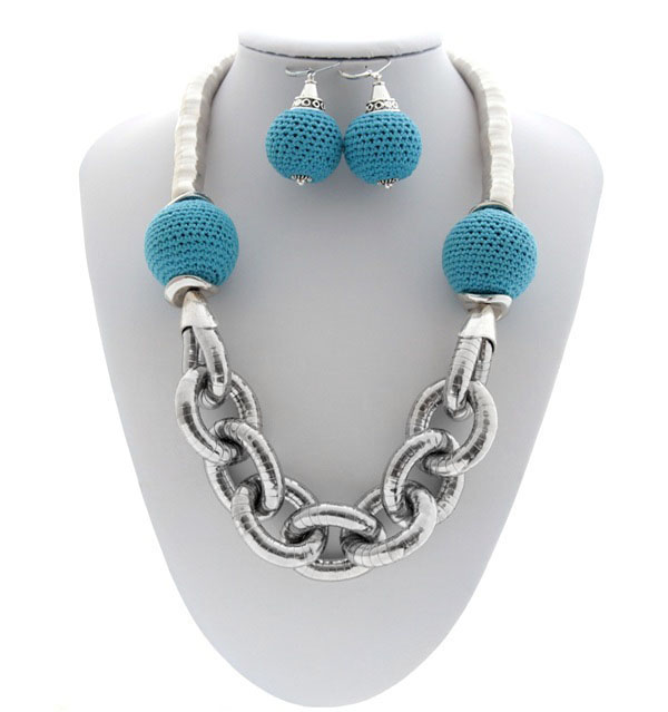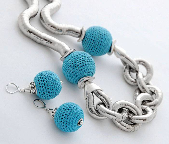 Ehtekomplekt suurte taevasiniste heegeldatud helmeste ja hõbedavärvi metalldetailidega. Rahvuslikel ainetel ehtekomplekti kuulub hõbedavärvi metallkapslitest “liikuv” kee ja suurte siniste heegeldatud helmestega kõrvarõngad.