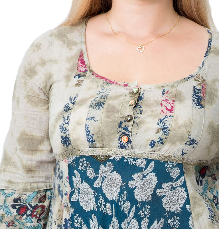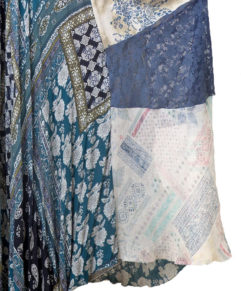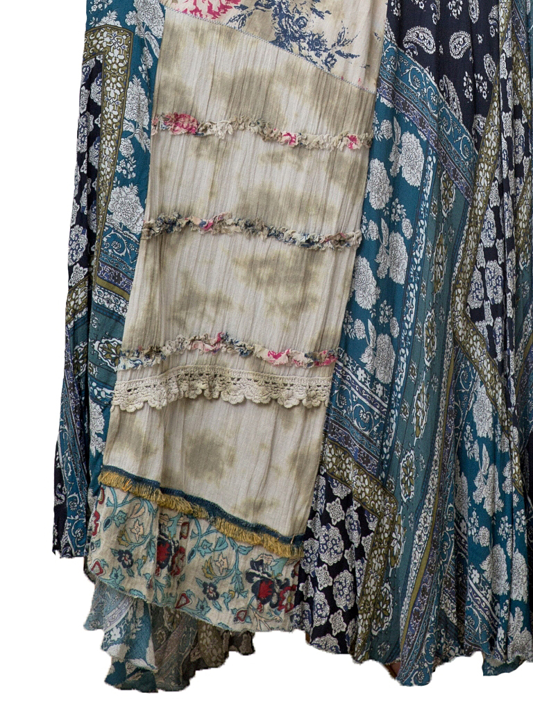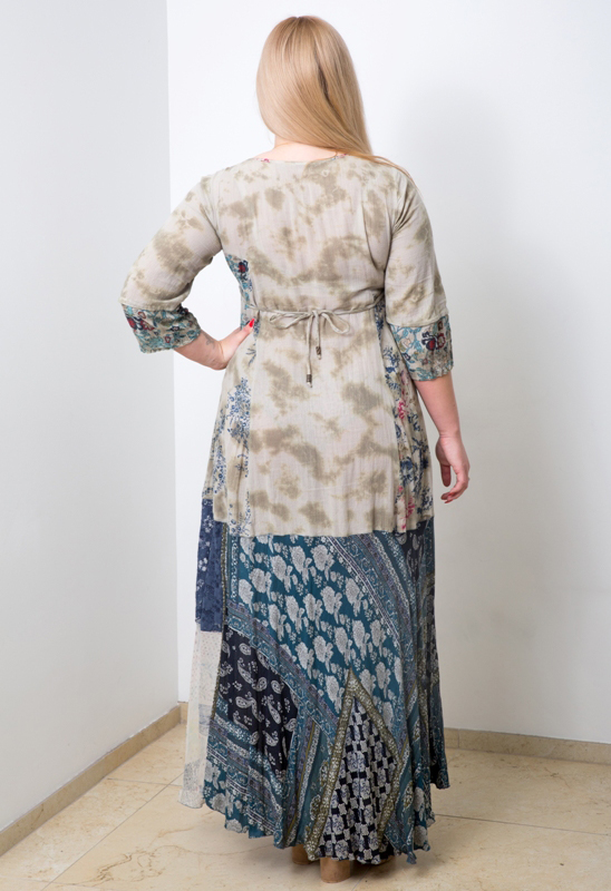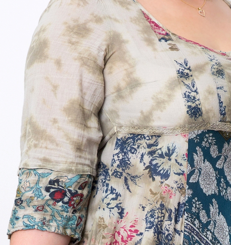 Varrukaotstes lillemustrilised, hõredakoelised puuvillasest kangast mansetid. Passe- ja seljaosa on batika-tehnikas värvitud õhukesest puuvillakangast, laias poolklošš-lõikelises seelikuosas on kasutatud pitsi, šifoonkangast ja mosaiik-trükimustriga hästilangevat bembergi (puuvillase ja viskoosi segu siidiselt pehme tekstuuriga kangas).