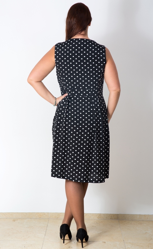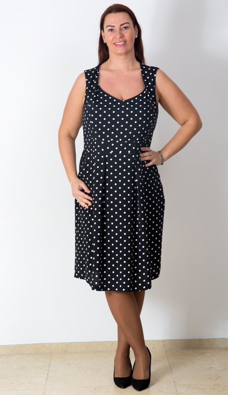 Mustast valgete täppidega viskooskangast varrukateta kleit punaste täpiliste lipsukestega. Kleidi ülaosa on töödeldud polüestertrikotaažist mustale voodrile, seelikuosa on ilma voodrita.