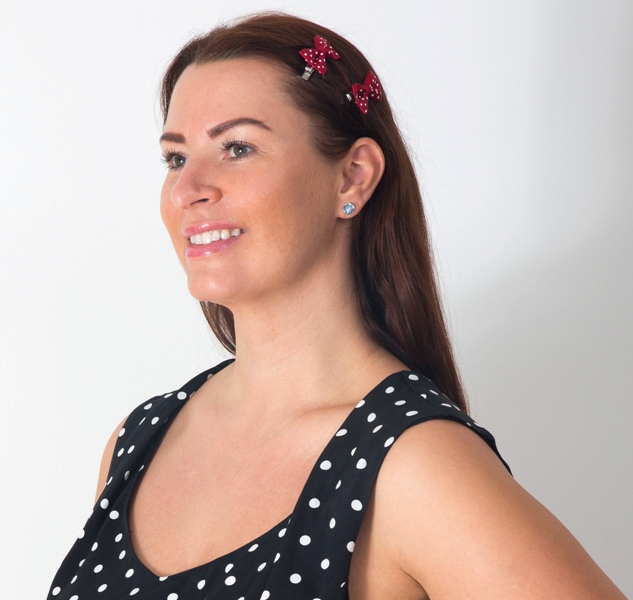 Komplekti kuuluvad tumepunasest valgetäpilisest tekstiilist lipsuga krokodill-kinnisega väikesed klambrid, mida saab kinnitada nii kleidi õlapaeltele kui ka juustesse. Klambri suurus on 2,5 cm x 4 cm