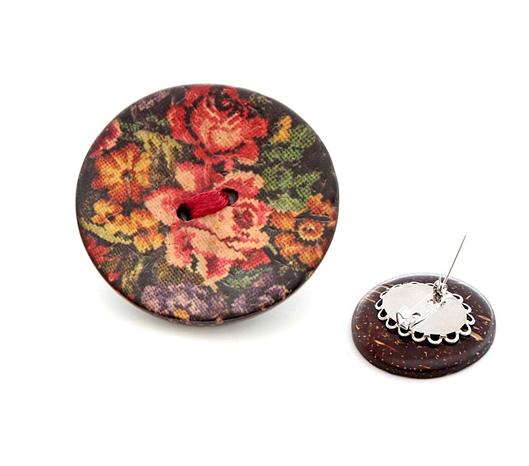 Jakk on õlakutega, kinniseks üks suur efektne kookosekoorest roosimustriline vintage stiilis nööp (diameeter 3 cm). Revääri kaunistab samasugusest suuremast nööbist käsitööna valminud pross. Prossi diameeter on 4 cm.