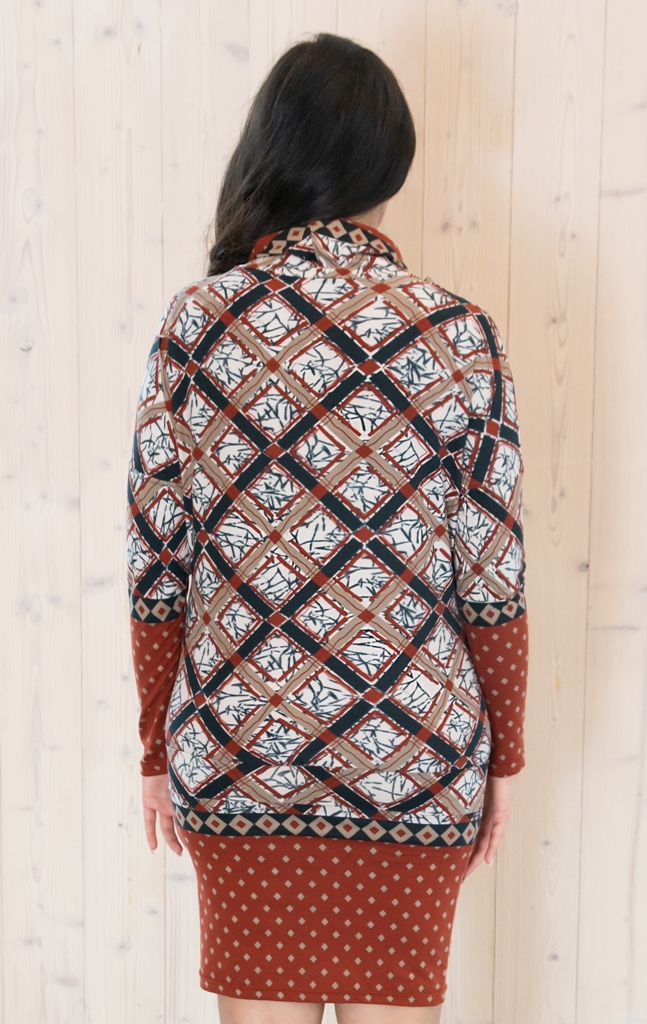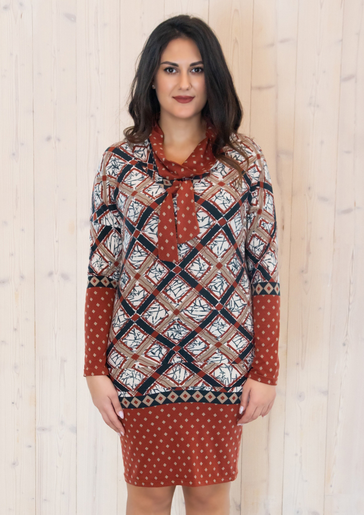 Mõnusalt pehmest, mittekortsuvast ja hästi vormihoidvast terrakotavärvi stretštrikotaažist ruudumustriline kõrge kaelusega kleit. Kleidi polüesterkanga sisemine pool on siidiselt pehme, pealmine pool mõnusalt sametine.