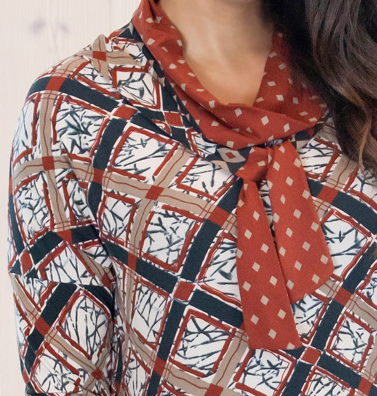 Topeltkangast kõrge kaelus on üsna avar ning langeb “sallina” ümber kaela, õlaõmbluste vahel on kleidi kangast paelad, mida saab jätta vabalt rippuma või kaunistuselemendina lipsuks siduda. Kleit on pikendatud kehaosaga ja sirgelõikeline. Kleidi alumine osa (põlvede kohalt) on eraldi külge õmmeldud ja kitsam ning liibuvam. Kimonolõikelised varrukad on ülalt avarad, allpool üsna kitsad.
