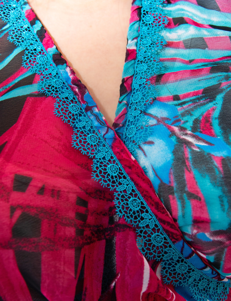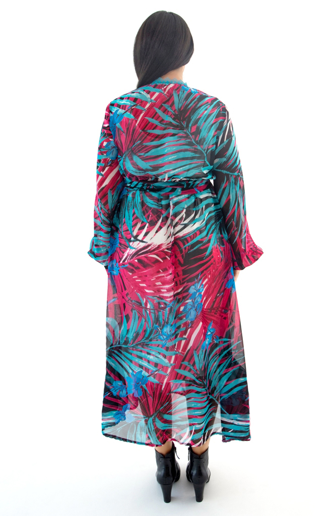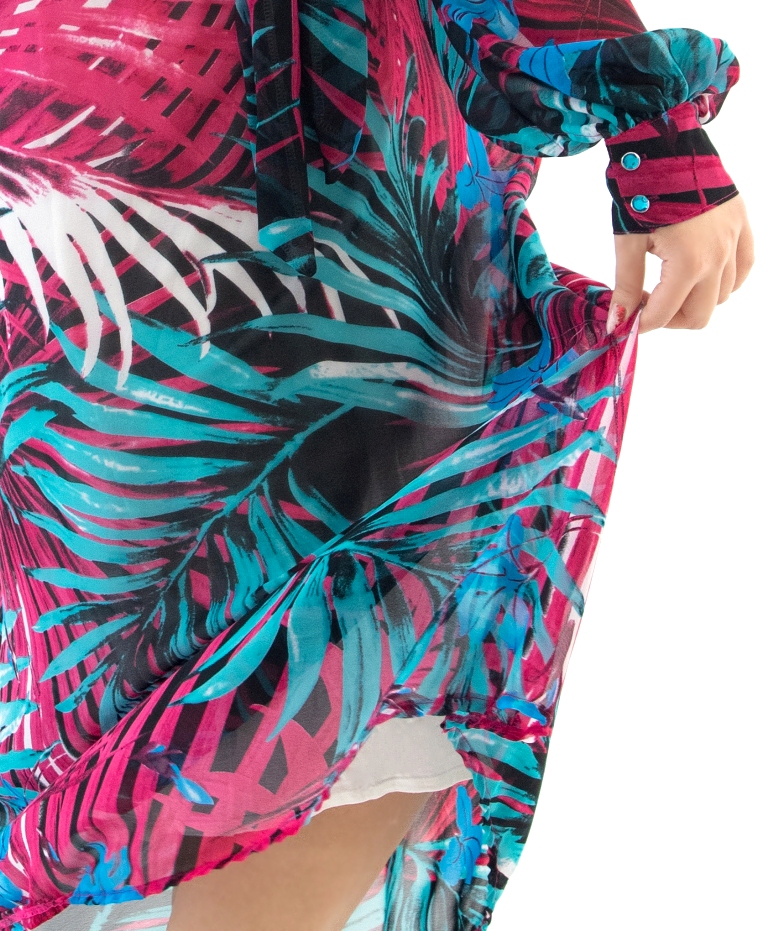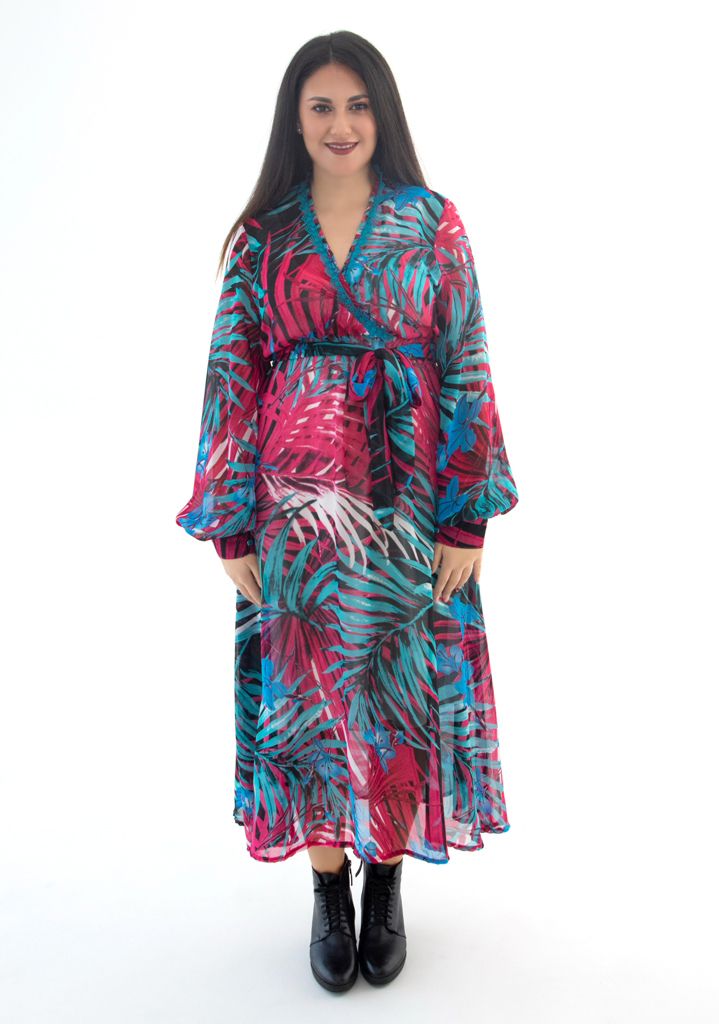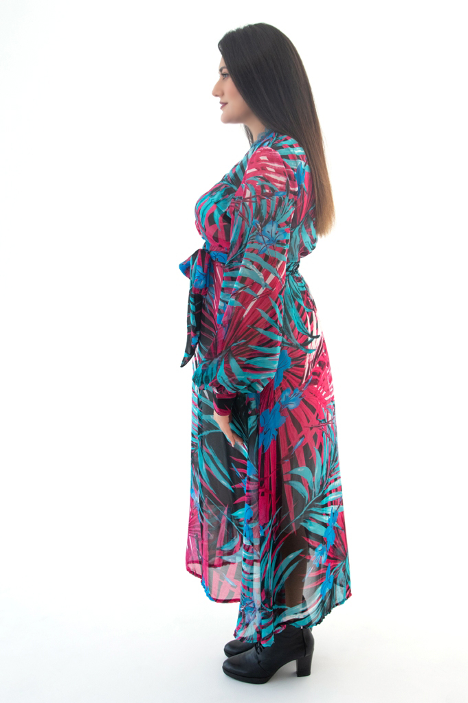 Türkiis-sinistes ja fuksiaroosades värvides troopikataimedega trükimustrilisest õhulisest ja hästilangevast polüesterkangast V-kaelusega maksikleit.