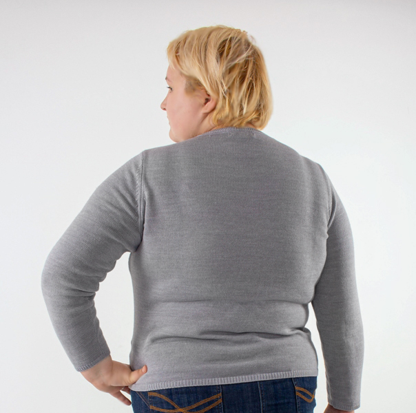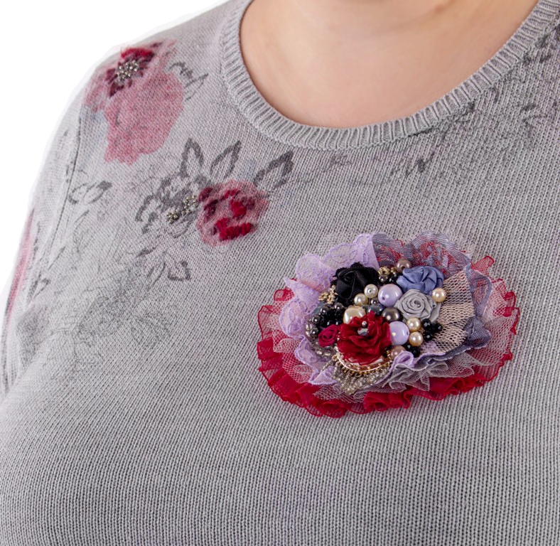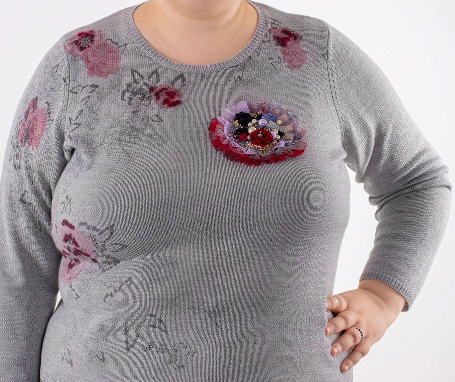 Helehallist puuvilla-ja akrüülisegu lõngast peenes silekoes pikkade varrukatega džemper lillemotiividega trükimustri ja tikandiga. Roosades ja tumehallides toonides lillemuster on kohati reljeefseks tikitud tumepunase villase lõnga ja väikeste hematiidivärvi seemnehelmestega. Džempri kaeluses, varrukaotstes ja allääres kitsas soonikkude.