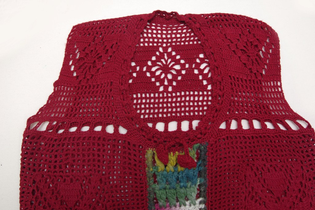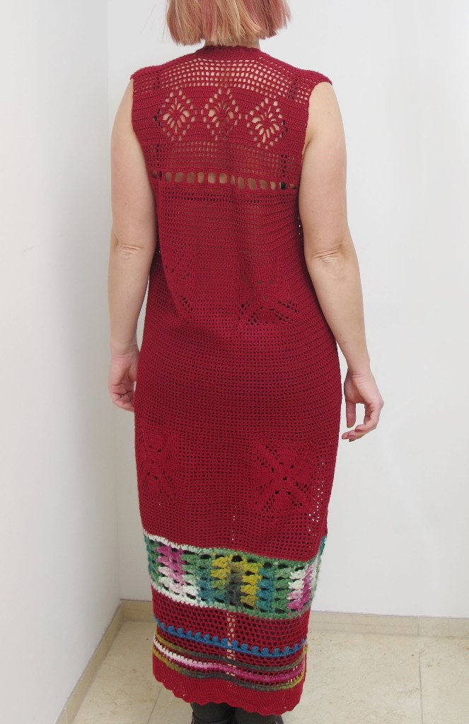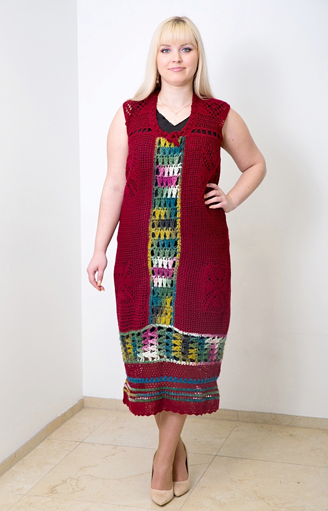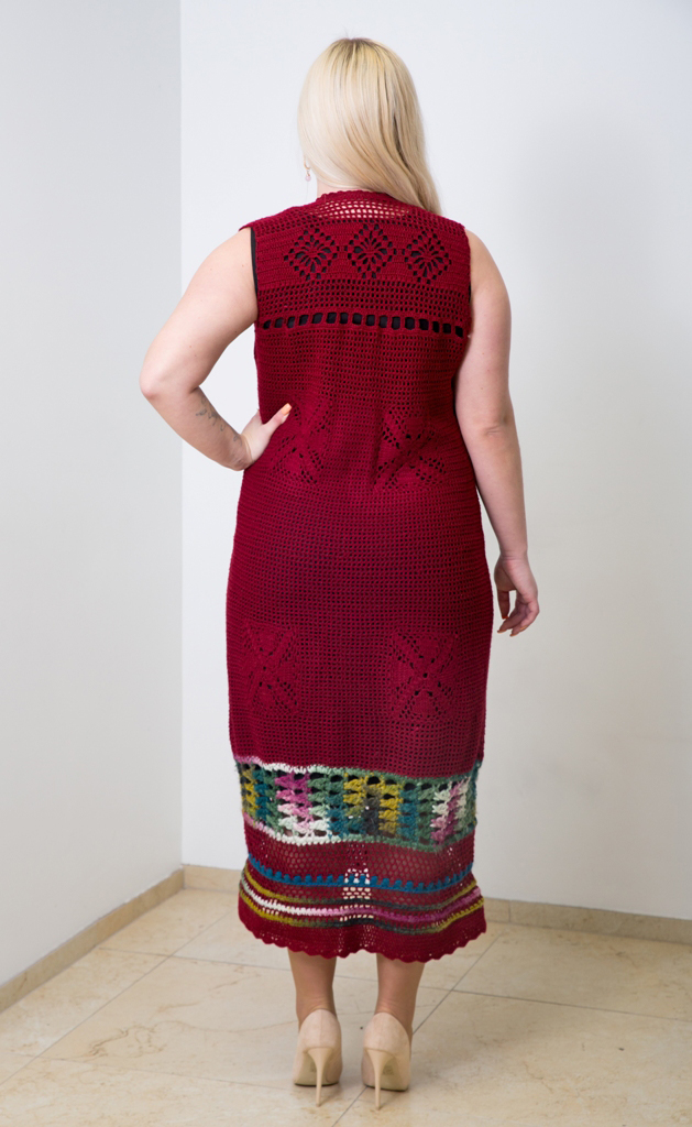 Villa ja akrüülisegu lõngast heegeldatud tumepunane varrukateta kleit. Kleidi kaelus on kroogitav kleidi lõngast heegeldatud paelaga. Paela otstes väikesed heegeldatud lillemotiivid.
