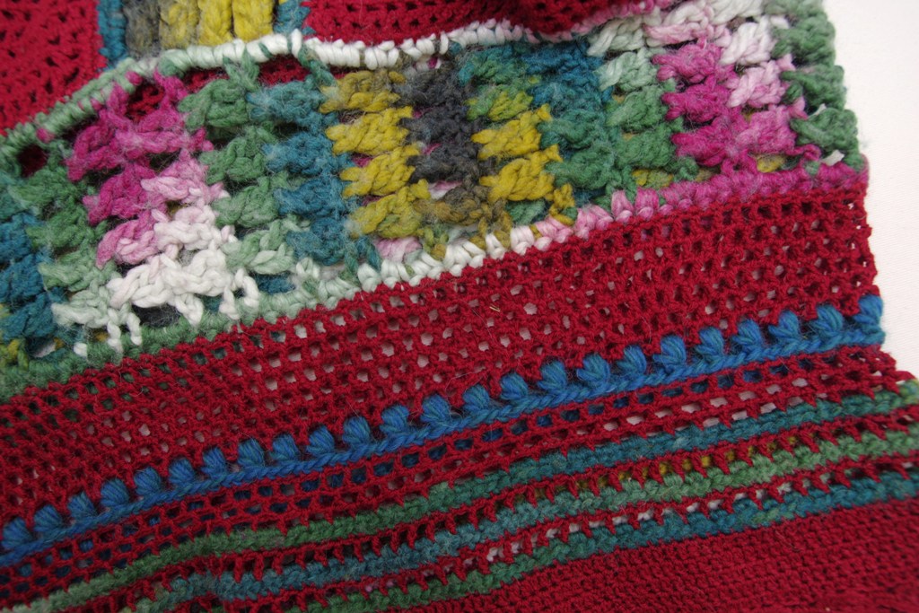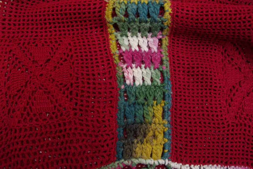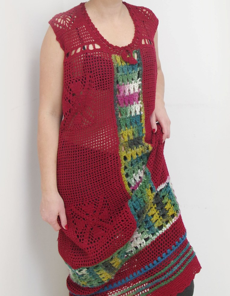Tegemist on redisain tootega. Kleidi algmaterjaliks on olnud tumepunane varrukatega pikk heegeldatud kampsun, mille varrukad on üles harutatud ning seejärel allosa triipudeks heegeldatud. Kleidi laiadeks “värvilisteks triipudeks” on üks algselt väljaveninud pikk sall. Osa sallist sai üles harutatud ning uuesti allosa värvilisteks triipudeks heegeldatud.