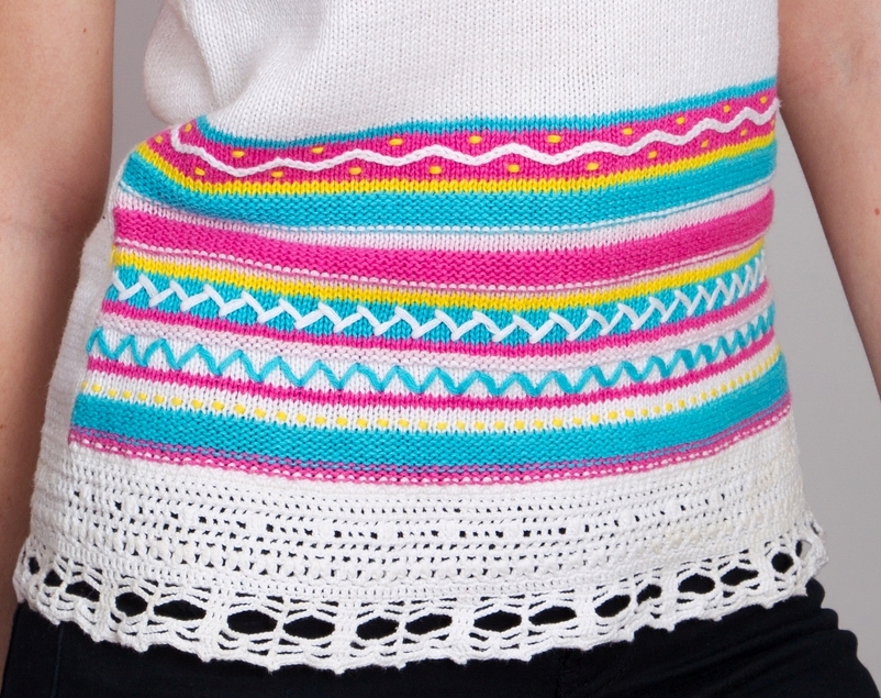 Valgest puuvillasest lõngast masinkootud kergelt taljes topp. Tagumine osa on üleni valge, ees kollase, heledama ja tumedama roosa ning helesinise puuvillase lõngaga kootud triibumuster.